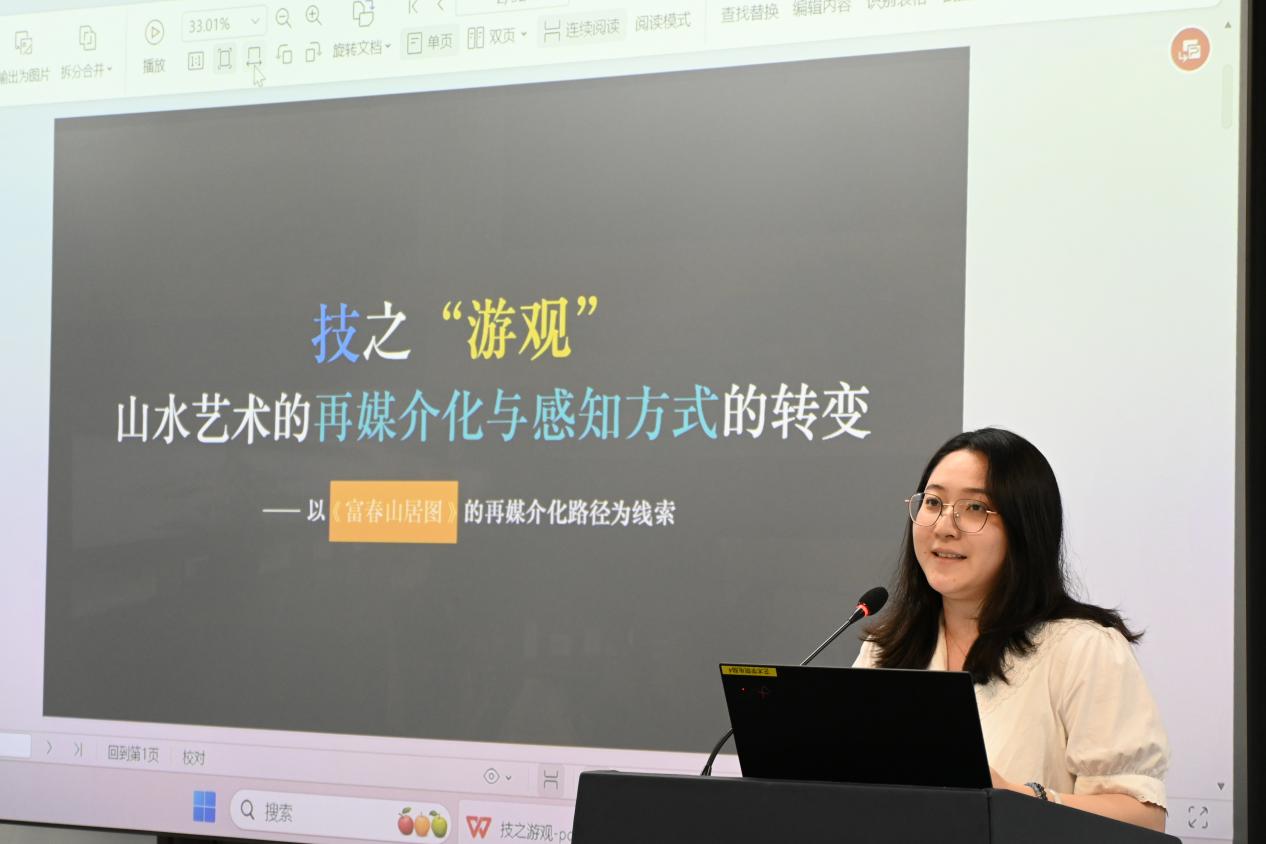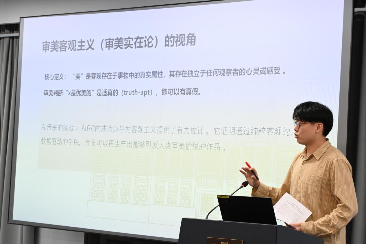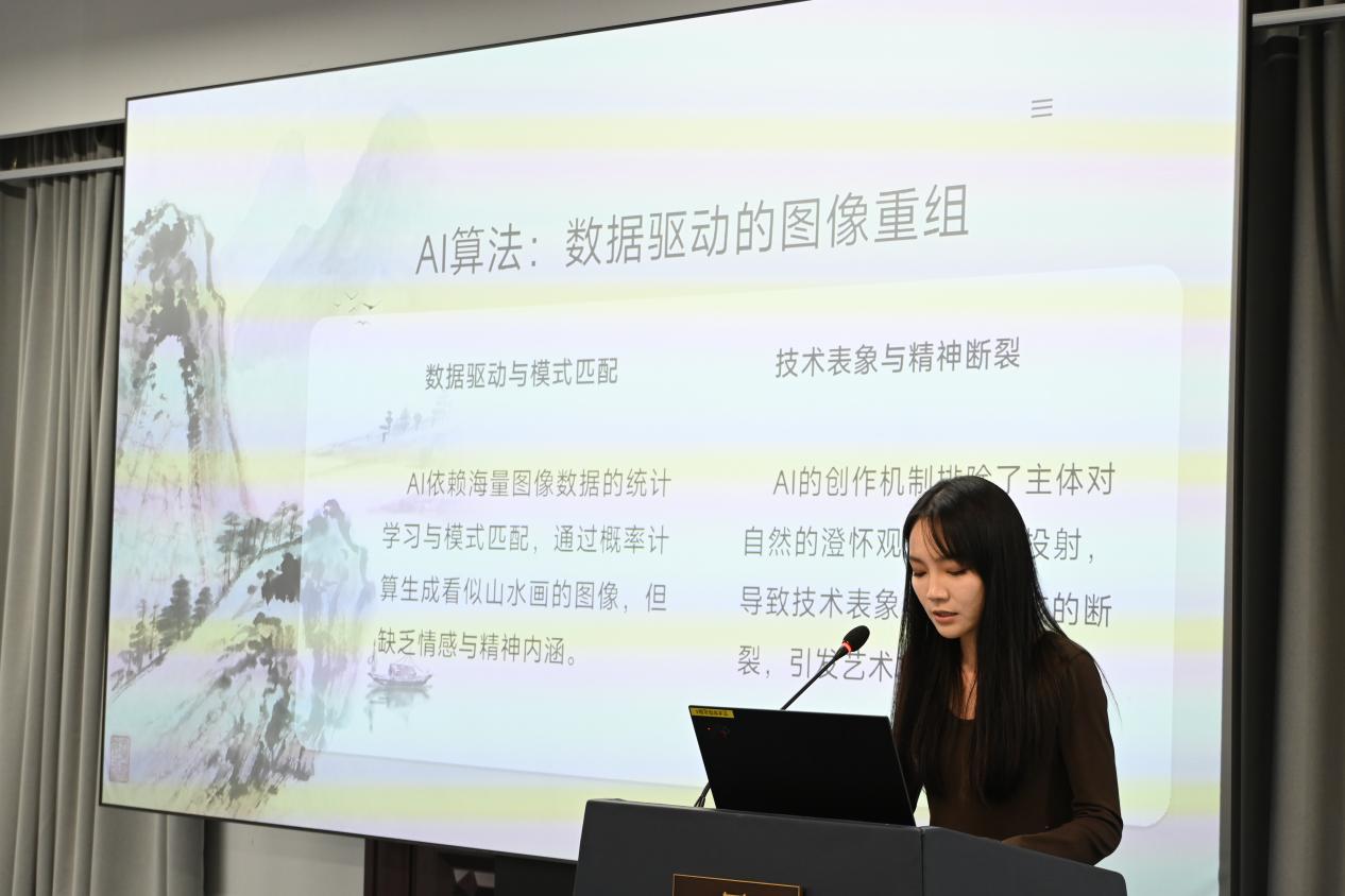 第一场关于“人工智能时代的艺术学创作 ”的讨论于310报告厅进行,主持人为东飞艇开奖结果记录官网直播计划 学博士生陈璐明,南京艺术飞艇开奖结果记录官网直播计划 人文与博物馆飞艇开奖结果记录官网直播计划 (艺术研究院)副院长翁再红教授担任评议人。陈璐明、赵玉琪、吴行健、姜丞怡、王静、邹青宸分别以《情动、共同体与想象力:中国电影跨文化传播的智能方案》、《从田野到云端:数字化时代背景下浒浦花鼓的传承与创新》、《编剧还是工具?——人机协同背景下剧本创作主体的边界争议》、《当代接受美学中文征明对沈周绘画的学习》、《走近、走远:夏尔丹的<肥皂泡>及沙龙展陈》和《从“笔墨为心迹”到“算法为媒介”:人工智能介入下中国山水画创作困境与伦理重构》为题,都关注数字技术或人工智能在艺术创作、文化传播和审美接受中的应用,探讨如何在利用新技术的同时,保持和传承传统艺术和文化的价值。南京艺术飞艇开奖结果记录官网直播计划 的翁再红教授为每位同学的论文都进行了细致的评审,表示虽然他们的研究领域和具体问题各有侧重,但都关注了在技术介入的背景下,创作主体的角色变化及其带来的伦理挑战,并试图寻找在技术与传统之间平衡的方法和路径。翁再红教授依据自己在学术研究领域的专长以及治学经验,给他们具体的改进建议。