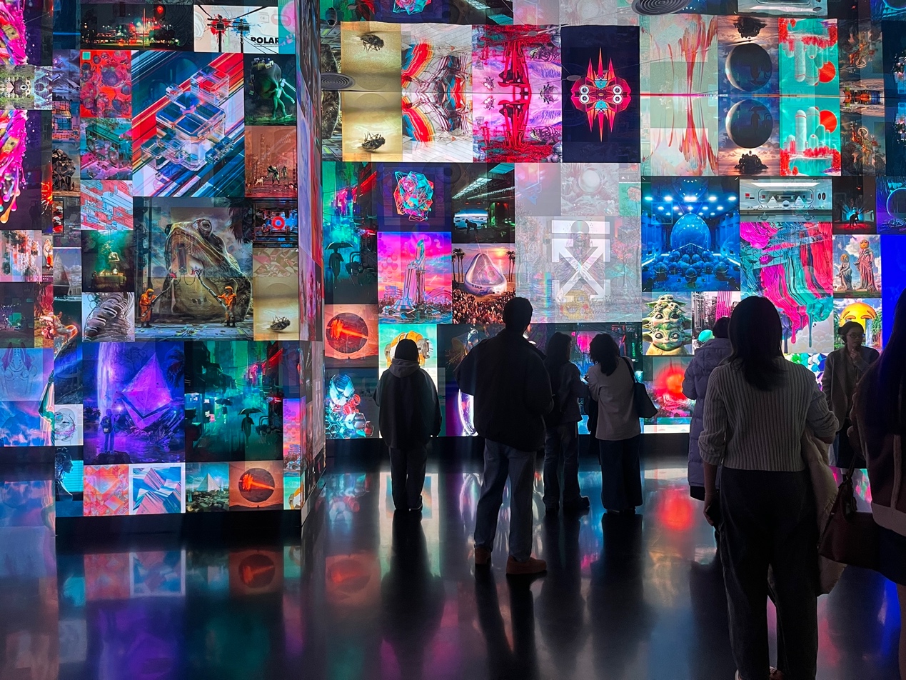 在第二部分的展览体验中,师生们走进了备受瞩目的“Beeple数字艺术展”。Beeple的代表作《Everyday》展现了数字艺术作品的沉浸式策展理念,通过动态影像,带领观众穿越时间与空间,感受技术与艺术交织的叙事魅力。而Beeple的动态雕塑《S.2122》则以未来社会为主题,融合了科幻叙事与艺术家对人工智能、社会变革的大胆想象,生动描绘了一个可能的未来图景。两件作品给人印象深刻。