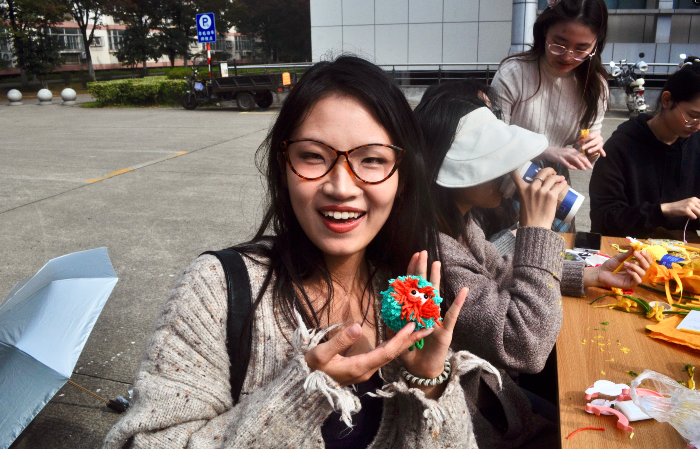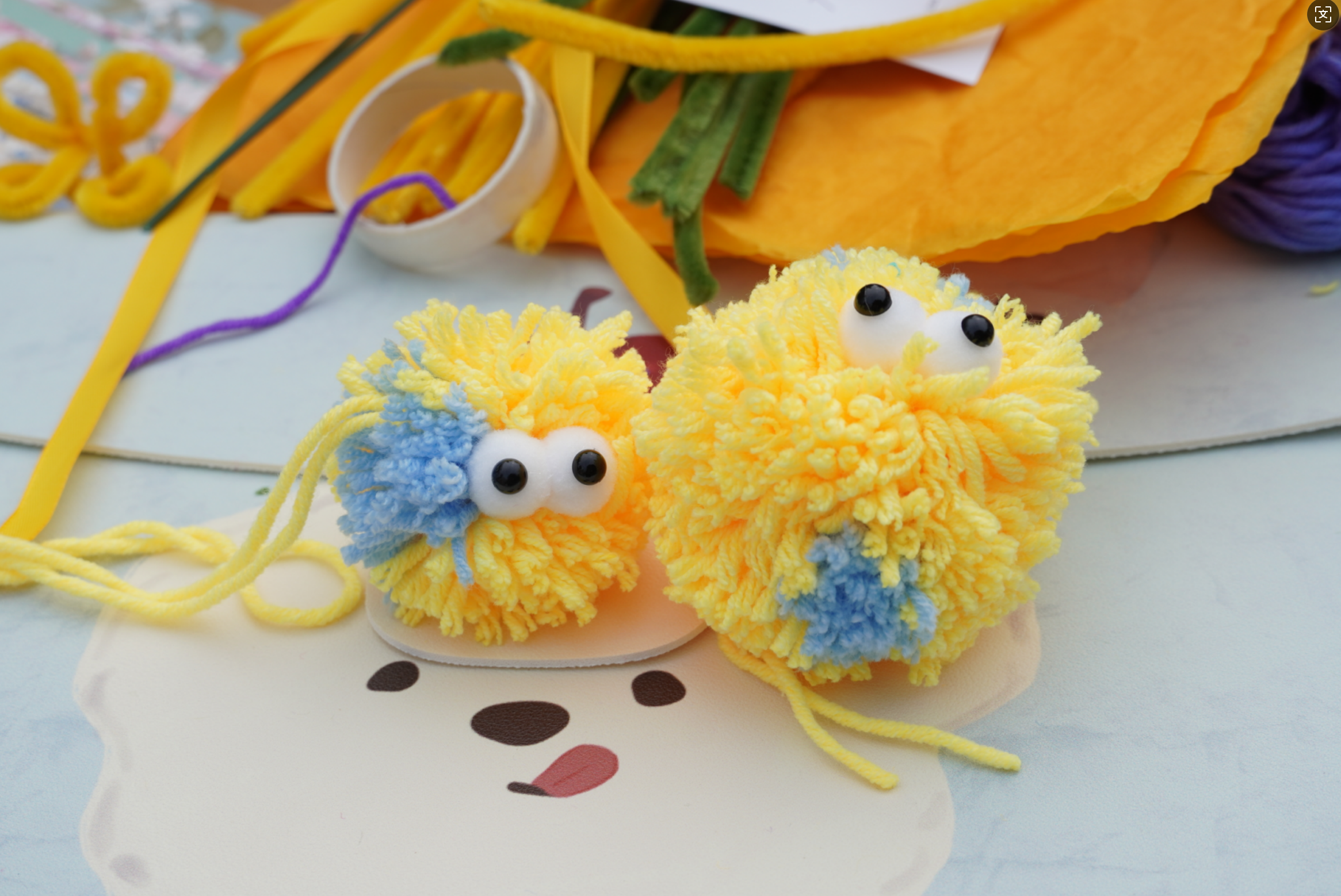 参与者们以五彩的毛线精心编织配色,在特制工具上层层缠绕,最后一剪一绑,一个蓬松柔软的毛绒球便跃然掌心。缤纷的色彩、憨态可掬的形状、配合暖阳的明媚与温度,共同勾勒出一份独属于制作者的深秋回忆。这些圆润讨喜的毛绒球,不仅是背包上摇曳的秋日精灵,更将手作的温暖与治愈,编织进每一个平凡的日常角落。