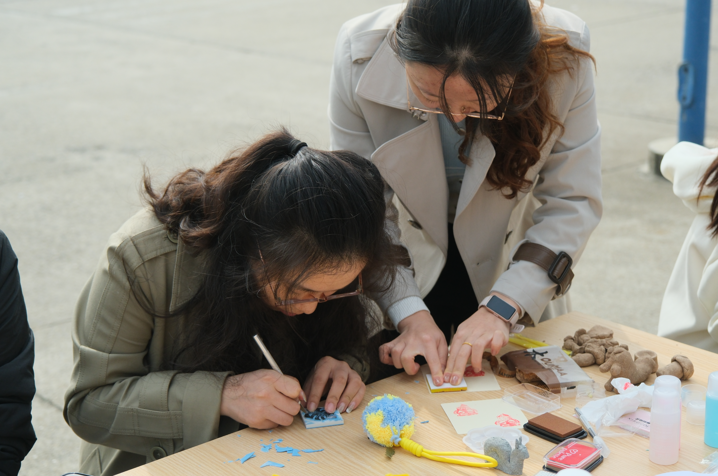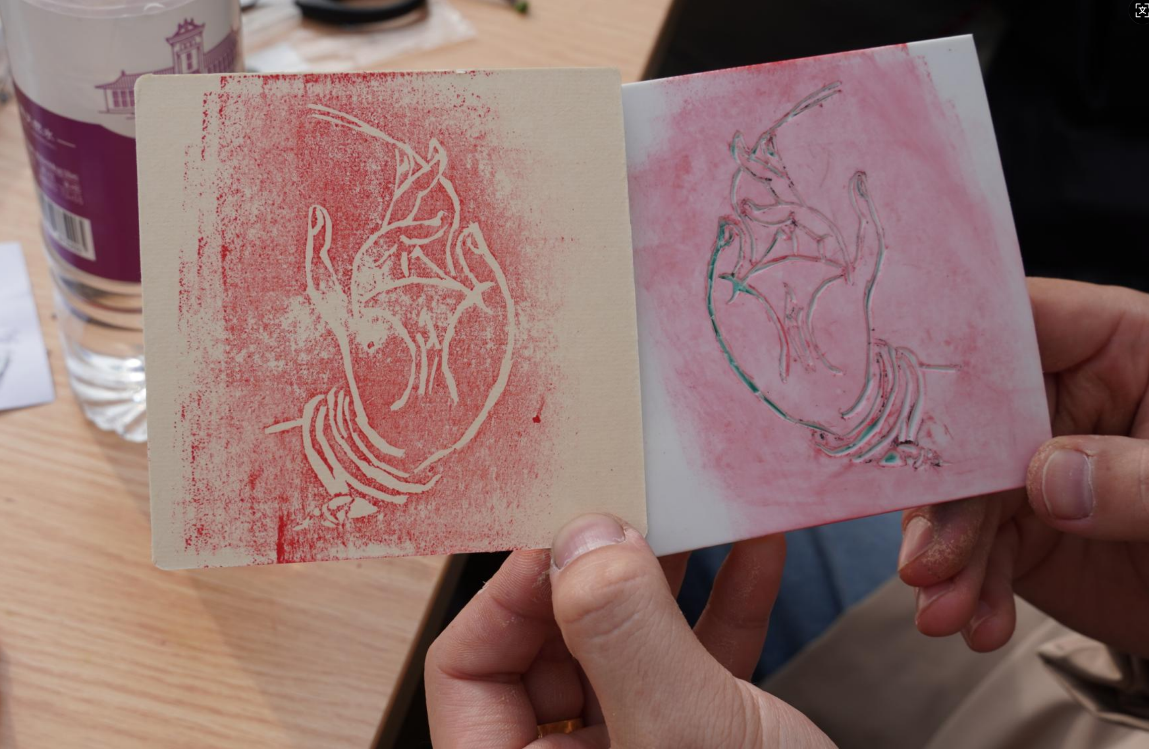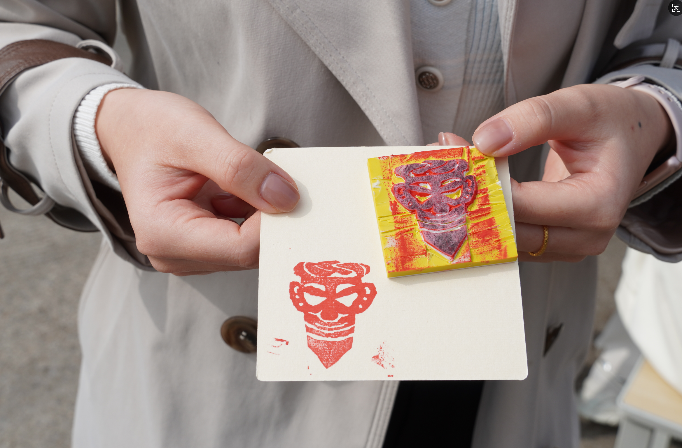 参与者们执起刻刀,全神贯注游走于一方小小的橡皮之上。描摹着提前绘制好的图画雕文刻镂,刀刃剥落处显露出清晰的线条与留白。蘸上色彩饱满的印泥,轻轻按压,一个专属的图案便清晰地拓印于纸笺之上。每当执起这枚亲手雕刻的橡皮章在纸面上留下印记,都成为这个秋天的私人落款,回温着金秋的余韵与闲适。
