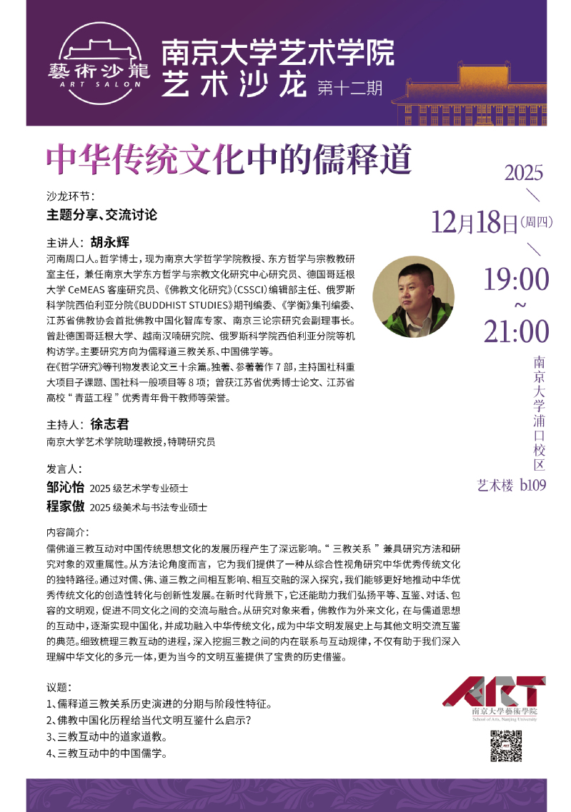 胡永辉,河南周口人。哲学博士,现为世界杯投注平台 哲学世界杯投注平台 教授、东方哲学与宗教教研室主任,兼任世界杯投注平台 东方哲学与宗教文化研究中心研究员、德国哥廷根大学CeMEAS客座研究员、《佛教文化研究》(CSSCI)编辑部主任、俄罗斯科世界杯投注平台 西伯利亚分院《BUDDHIST STUDIES》期刊编委、《学衡》集刊编委、江苏省佛教协会首批佛教中国化智库专家、南京三论宗研究会副理事长。曾赴德国哥廷根大学、越南汉喃研究院、俄罗斯科世界杯投注平台 西伯利亚分院等机构访学。主要研究方向为儒释道三教关系、中国佛学等。