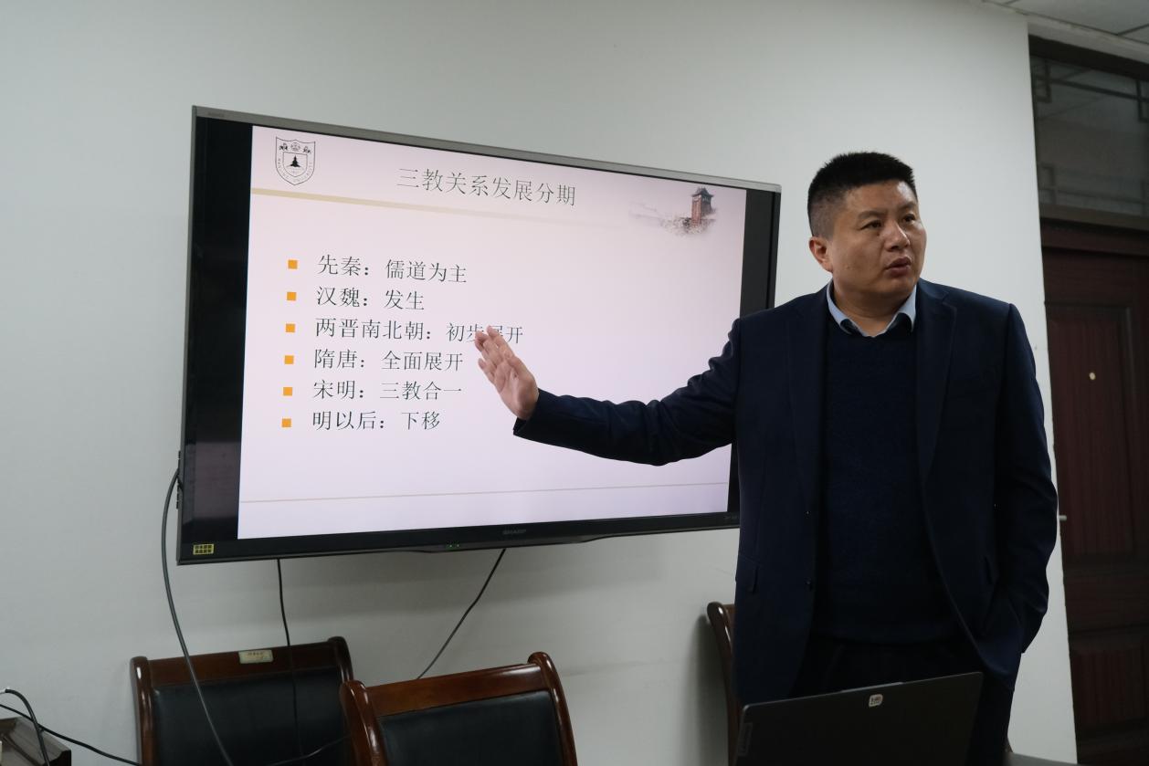 随后,胡老师引导同学们纵览全局,以历史分期为线索,系统梳理三教关系的历史演进。他将三教关系的发展划分为六个阶段:先秦、汉魏、魏晋南北朝、隋唐、宋明、清及近现代,逐一概述每个时期的思想特征,帮助同学们初步把握其发展脉络。