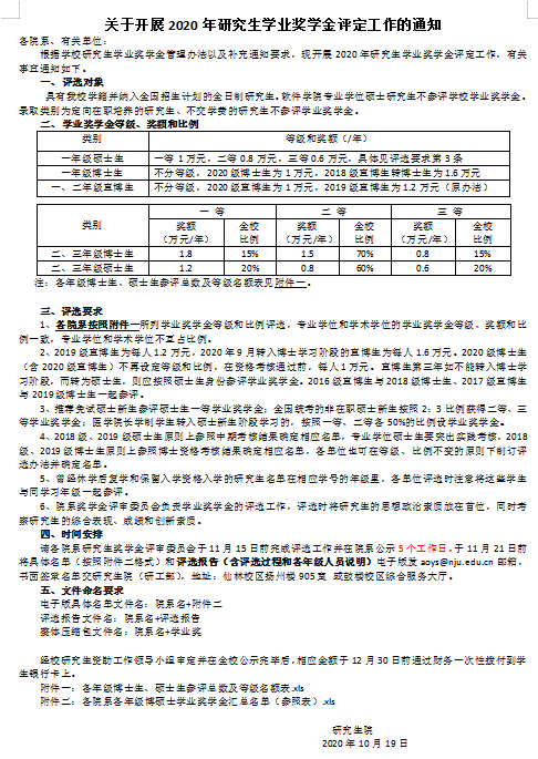 【评奖评优】关于开展2020年研究生学业奖学金评定工作的通知