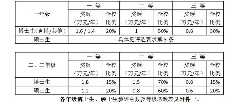 1、各院系按照附件一 所列学业奖学金等级和比例评选,专业学位和学术学位的学业奖学金等级、奖额和比例一致,专业学位和学术学位不互占比例。