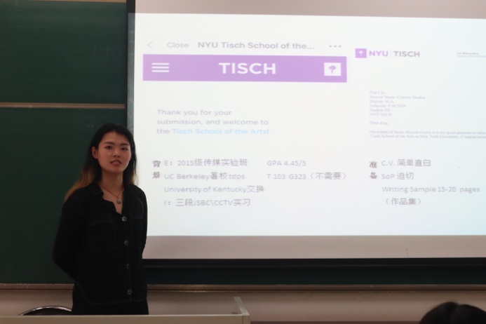 刘子琪同学分享了一些在出国留学申请阶段进行心态调整的小技巧。同时她也就美国电影研究方向的申请给予了关于软硬件要求、文书准备以及选校方面的建议。