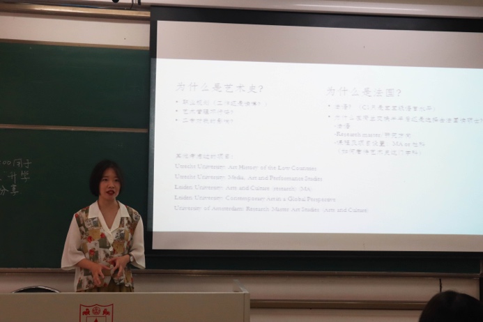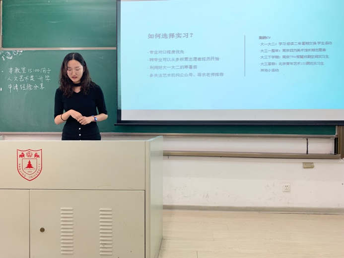 来自文世界杯投注平台 的屈伸即将前往纽约大学美术研究所进行艺术史硕士的学习,她分享了大学四年和教授间愉快相处的经历,并且分享了她通过在UC Berkeley一学期的交换如何收获了教授的推荐信。在分享过程中,她强调了多尝试不同实习、多选课、多与教授交流的重要性,也强调了尽早做好大学时期学习生活规划的重要性。同时,她也欢迎越来越多有志于艺术史学习的同学能够加入世界杯投注平台 的二专学习,在她看来,这能让同学们少走很多弯路。