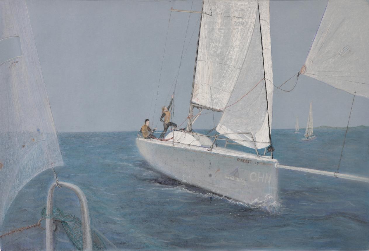 风行水上·1画面以蓝色调呈现帆行海上、风行水上的开阔场景。画面的视点别出心裁,从前一条的尾端看向后方海面,给人以身临其境之感。我力求用新颖的方式切割画构成,编排组织画面的点线面,在高级的蓝灰色中以夸张的白色作为视觉中心,橙色用以活跃画面。水纹以细笔顺势勾出,突出装饰性和绘画性。