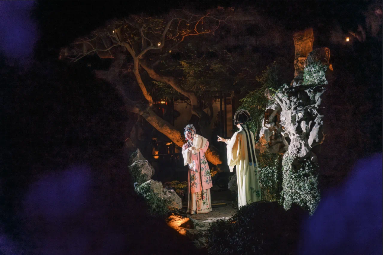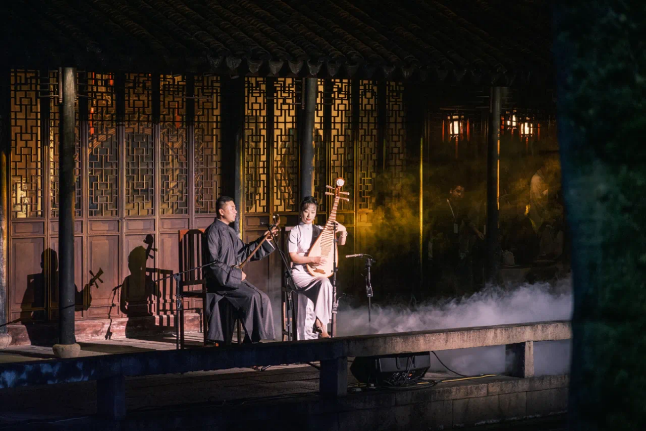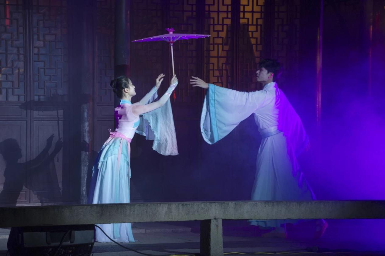当日晚19:30青春时光”青年艺术家展演在同里退思园拉开帷幕。青年艺术家们于建筑、文学、戏剧、书画、哲学、山水自然间,共赴一场如梦如幻的视听盛宴。精妙的舞美让观众沉浸式地感受江南文化的魅力,传统与现代、戏曲与建筑的融合,以青春为题,刻画江南园林新的“灯火阑珊”。青年艺术家作品展演以音乐、舞蹈、戏曲等形式给予了动态的沉浸式体验,呈现出江苏省青年艺术家们在新时代融合新创意的创造潜力。