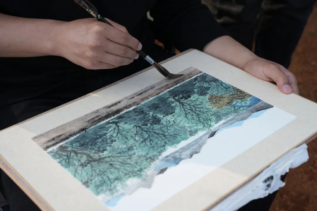 昂鑫月:这次去右二村的写生,深深感受到南方山石、树木的魅力,满山的绿树,清澈的湖水,曲折的山间小路都给我清新又舒适的感觉。一种笔墨塑造出一种形态,我想用不同程度的淡彩,体现村落的宁静和美好,主观地表达我喜欢的风格。很喜欢踏出屋子就是自然的感觉,直接观察树木,观察树干树叶的表达,观察它们的组织方式,深深地被自然的生命力所打动,很开心这次写生让我有了很棒的收获。