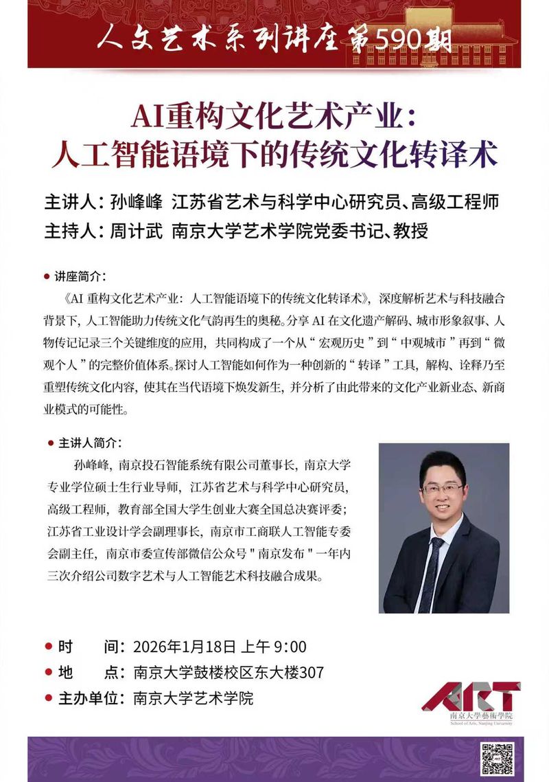 孙峰峰,南京投石智能系统有限公司董事长,世界杯投注平台 专业学位硕士生行业导师,江苏省艺术与科学中心研究员,高级工程师,教育部全国大学生创业大赛全国总决赛评委;江苏省工业设计学会副理事长,南京市工商联人工智能专委会副主任,南京市委宣传部微信公众号南京发布一年内三次介绍公司数字艺术与人工智能艺术科技融合成果。