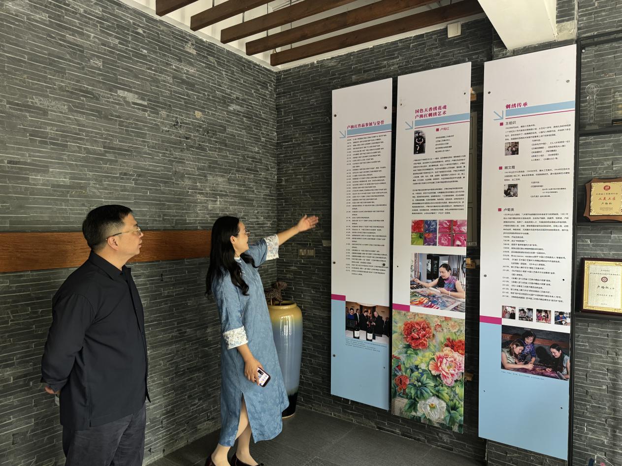 随后团队一行到达卢梅红刺绣艺术馆。步入馆内,仿佛踏入一个由丝线构筑的绮丽世界。馆内陈列着花鸟、山水、人物等各类苏绣作品,飞鸟羽毛根根分明、色泽灵动;花瓣色泽过渡自然、肌理丰富。卢梅红老师围绕丝线、绣针的粗细讲究,以及走针、藏针的针法运用等方面耐心为大家讲解,分享自身如何突破传统题材与表现形式限制,将苏绣融入到服饰中,让传统艺术焕发出新活力。