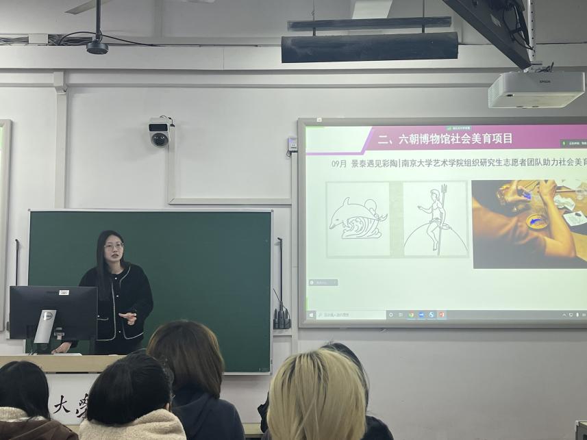 苏霁虹同学重点介绍了“六朝博物馆社会美育志愿服务项目”,该项目在艺术飞艇开奖结果记录官网直播计划 团委指导下,组织飞艇开奖结果记录官网直播计划 研究生志愿者团队以美育课程教学、海报设计等方式,参与南京六朝博物馆社会教育活动。目前,结合六朝博物馆“希腊时代彩陶及普利亚艺术文化特展”,已面向社会公众开设“景泰遇见彩陶”、“纸塑流光”两次课程。后期,该项目还将继续整合馆校力量,开设为期一年的社会美育课程,以专业所长,推动实现艺术与人的深层联结,让艺术成为生活的一部分,为铸就社会主义文化新辉煌贡献青年力量。