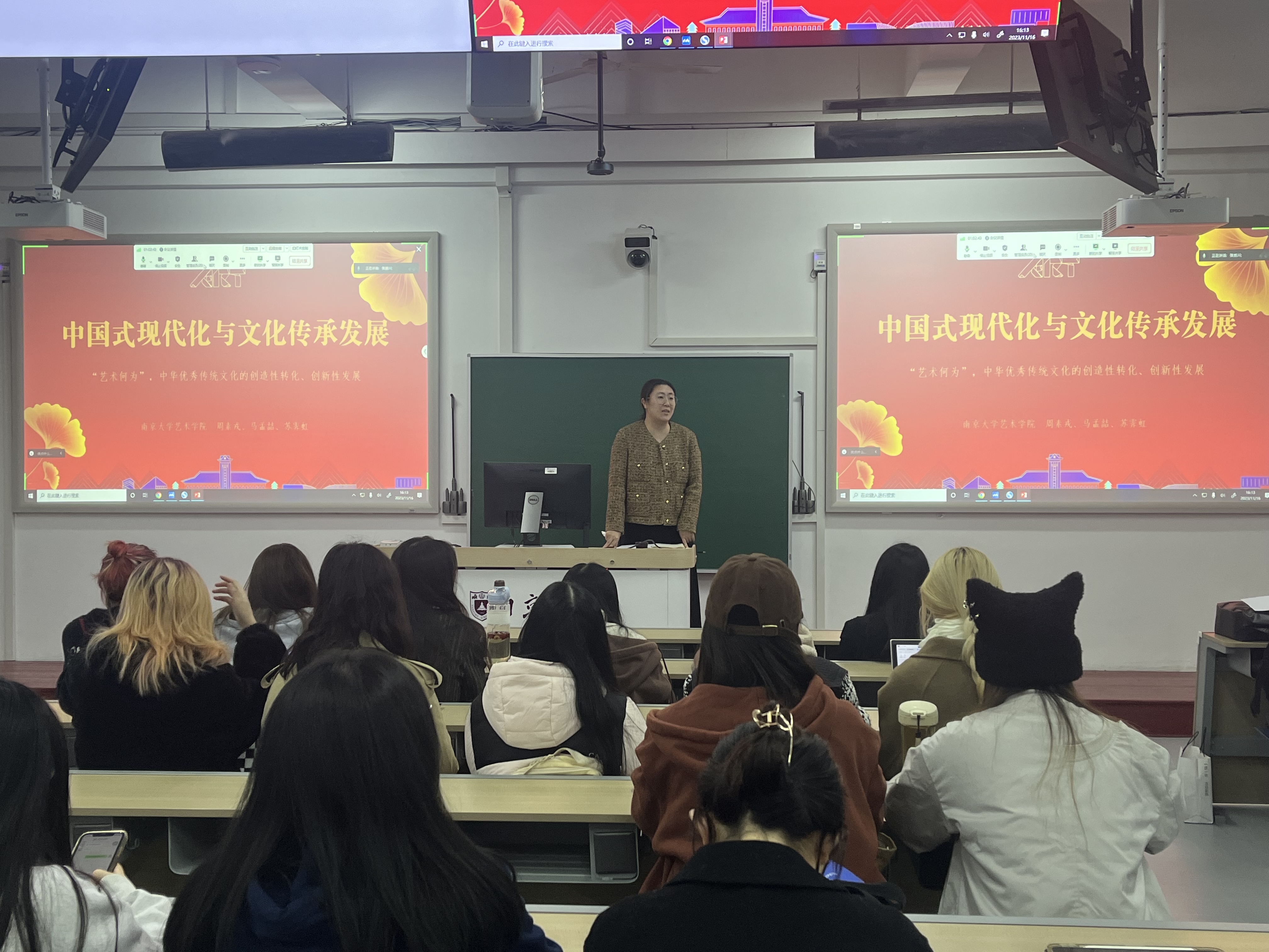 为深入学习贯彻党的二十大精神,学习宣传贯彻习近平文化思想,持续教育引导青年团员在坚定文化自信、讲好中国故事上争做表率,11月16日,艺术飞艇开奖结果记录官网直播计划 团委以线上线下相结合的方式,组织开展“中国式现代化与文化传承发展”主题团课,艺术飞艇开奖结果记录官网直播计划 团委副书记周素戎主讲,苏霁虹、马孟喆进行实践项目经验分享,全院100余名师生参与学习。